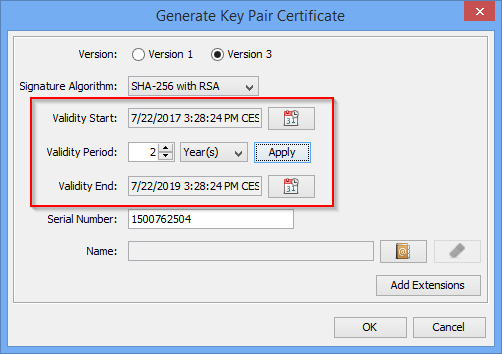 The validity of a certificate generated by KSE used to start at the point of time when it was issued. The certificate generation dialog only provided a setting for a validity period in years, months, weeks or days and the validity end date was calculated by adding this period to the current date and time. Most of the times this is sufficient. However, there are scenarios where it is necessary to create a certificate with a notBefore that lies in the past or in the future.