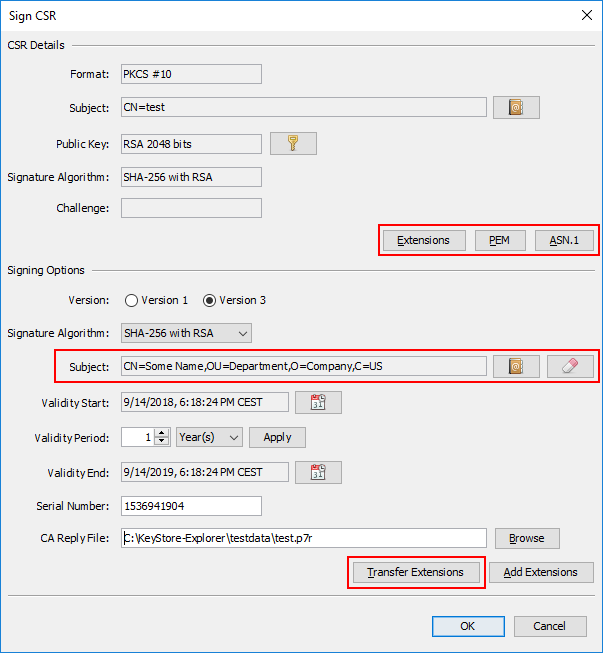 It is possible to add certificate extensions to a CSR. KSE can now transfer those extensions to the certificate. Every single extension from the CSR can then be edited or removed and additional extensions can be added.